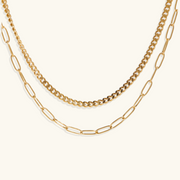 The Bella Layered Necklace embodies effortless elegance and layered sophistication. Featuring a dual-chain design, with one being a bold paperclip link and the other a classic curb chain, this piece strikes the perfect balance between edgy and timeless. The golden hues glimmer against the skin, creating a luxurious yet understated look.