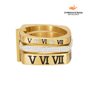 Esse é o Anel Triplo Romanos - uma combinação única de três anéis que se unem para criar uma peça deslumbrante e elegante.
