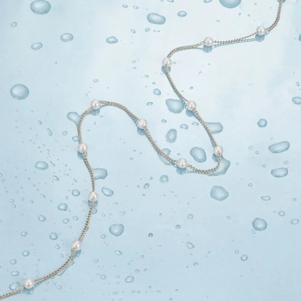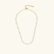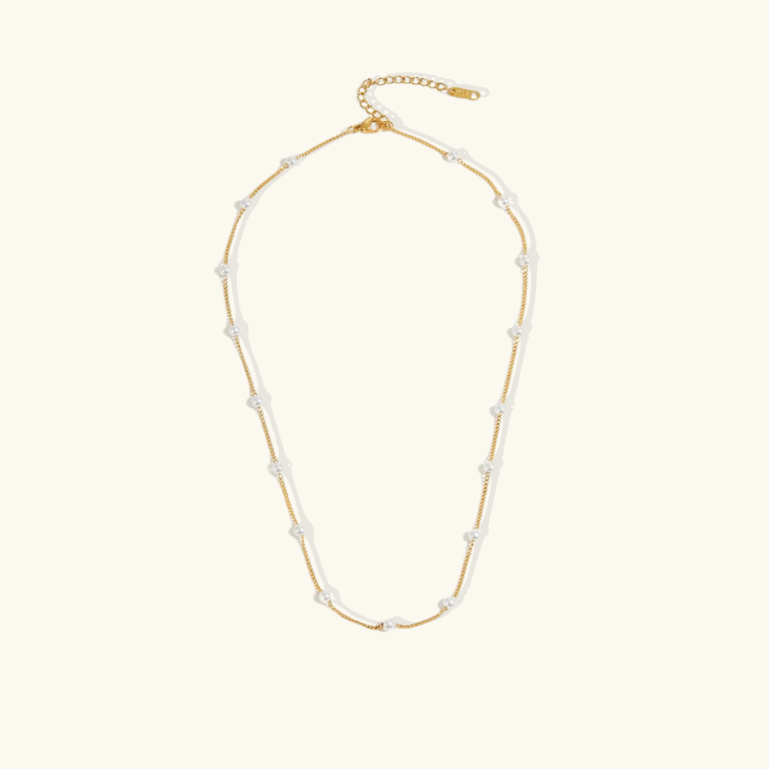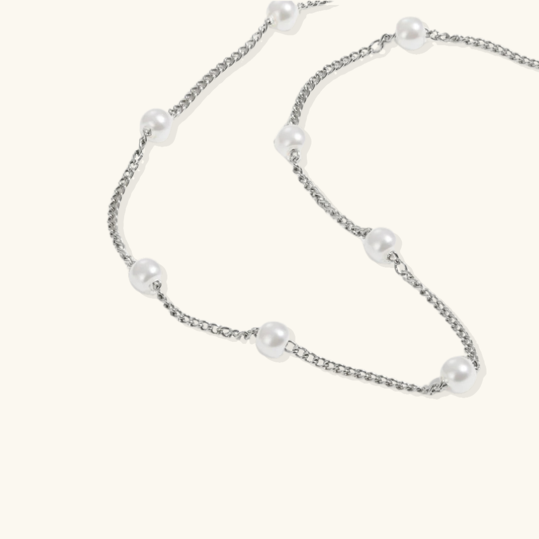 Graceful and timeless, the Naomi Pearl Necklace captures the essence of understated elegance. Featuring luminous pearls delicately spaced along a fine gold or silver chain, it brings a subtle yet enchanting glow to your neckline.