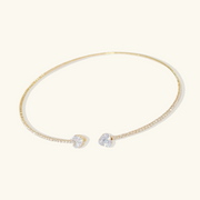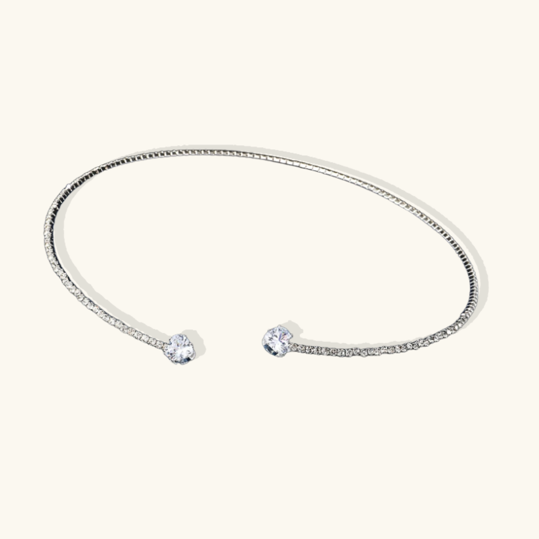 Radiant and refined, the Radiant Heart Choker wraps around your neck with an ethereal touch of sparkle and love. Two shimmering heart-cut gems rest delicately at each end of the open choker, catching light with every movement. The thin band adorned with smaller crystals enhances the subtle elegance, creating a balance between boldness and delicacy.