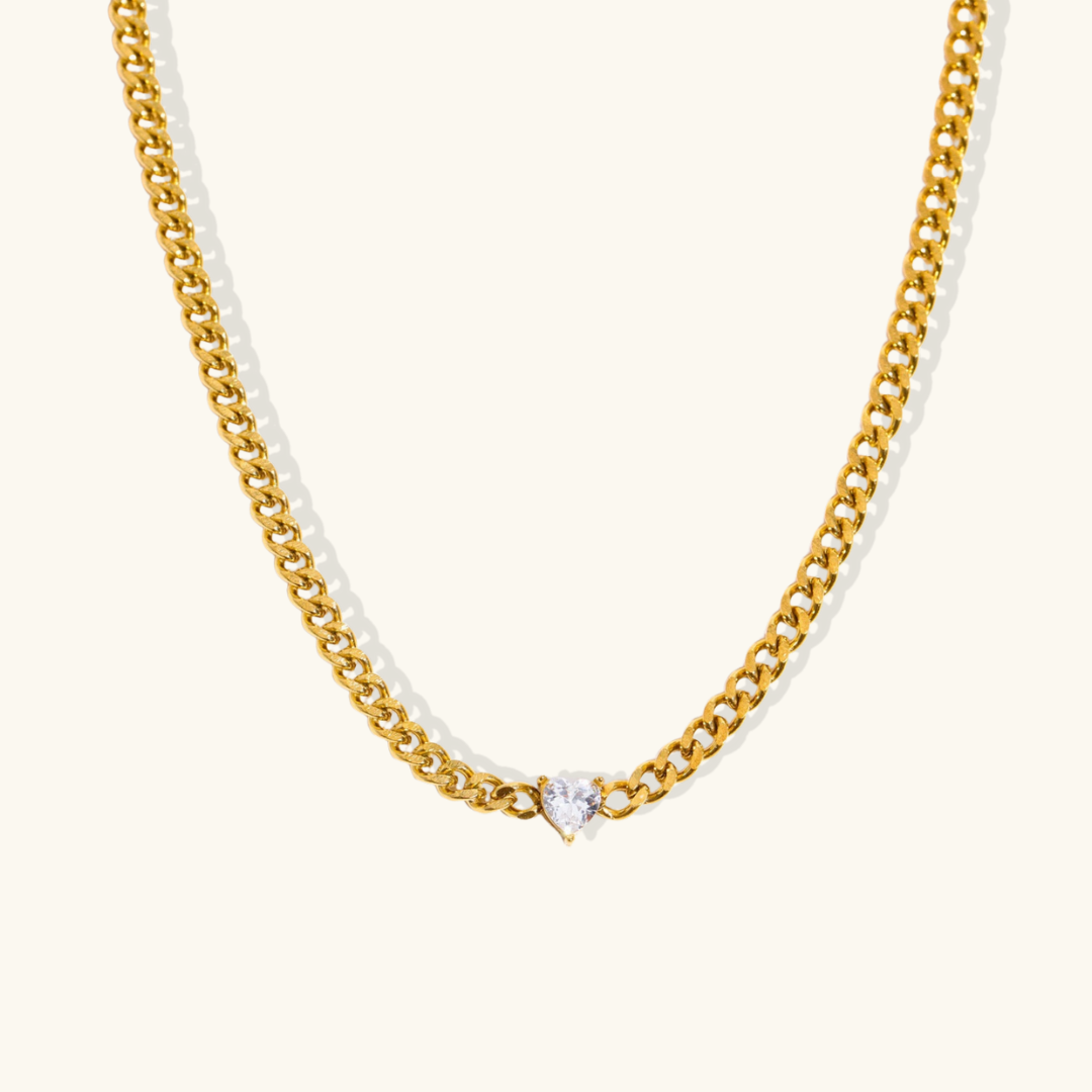 The Venetian Heart Necklace features a radiant heart-shaped pendant adorned with sparkling cubic zirconia. Its elegant gold-plated chain adds a touch of luxury, perfect for any occasion. The adjustable length ensures a comfortable and secure fit, making it a versatile addition to your jewelry collection. Embrace the charm and sophistication of this timeless piece.